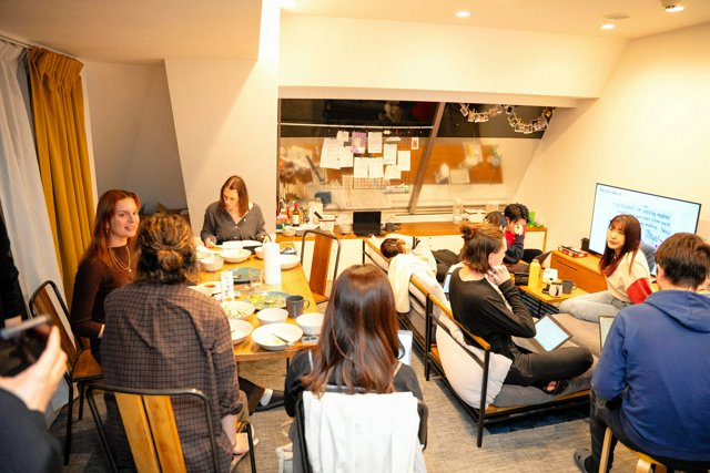 賃料は水道光熱費込みで8万6千円から。トイレやシャワールーム、キッチンは共用で、約4.5~7畳の鍵付きの個室がある。入居の条件は「交流意欲」。日本人と外国人、男女の比率は半々になるように運営しているという。ダイニングテーブルやソファがある共用リビングでは、日本語と英語が飛び交い、毎週のように「たこ焼きパーティー」などが開かれる。