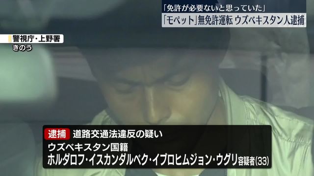 警視庁によりますと、ウズベキスタン国籍のホルダロフ・イスカンダルベク・イブロヒムジョン・ウグリ容疑者は今月8日、台東区東上野の路上で、ペダル付き原付バイク「モペット」を無免許で運転した疑いがもたれています。