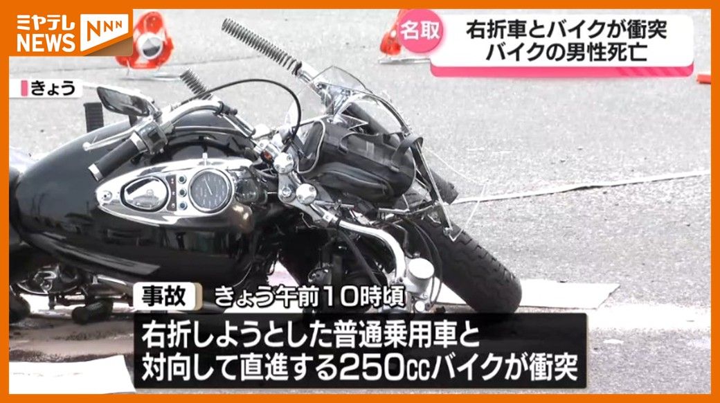 21日午前、宮城・名取市の交差点で、右折しようとした乗用車と直進するバイクが衝突する事故があり、バイクの男性が死亡しました。
