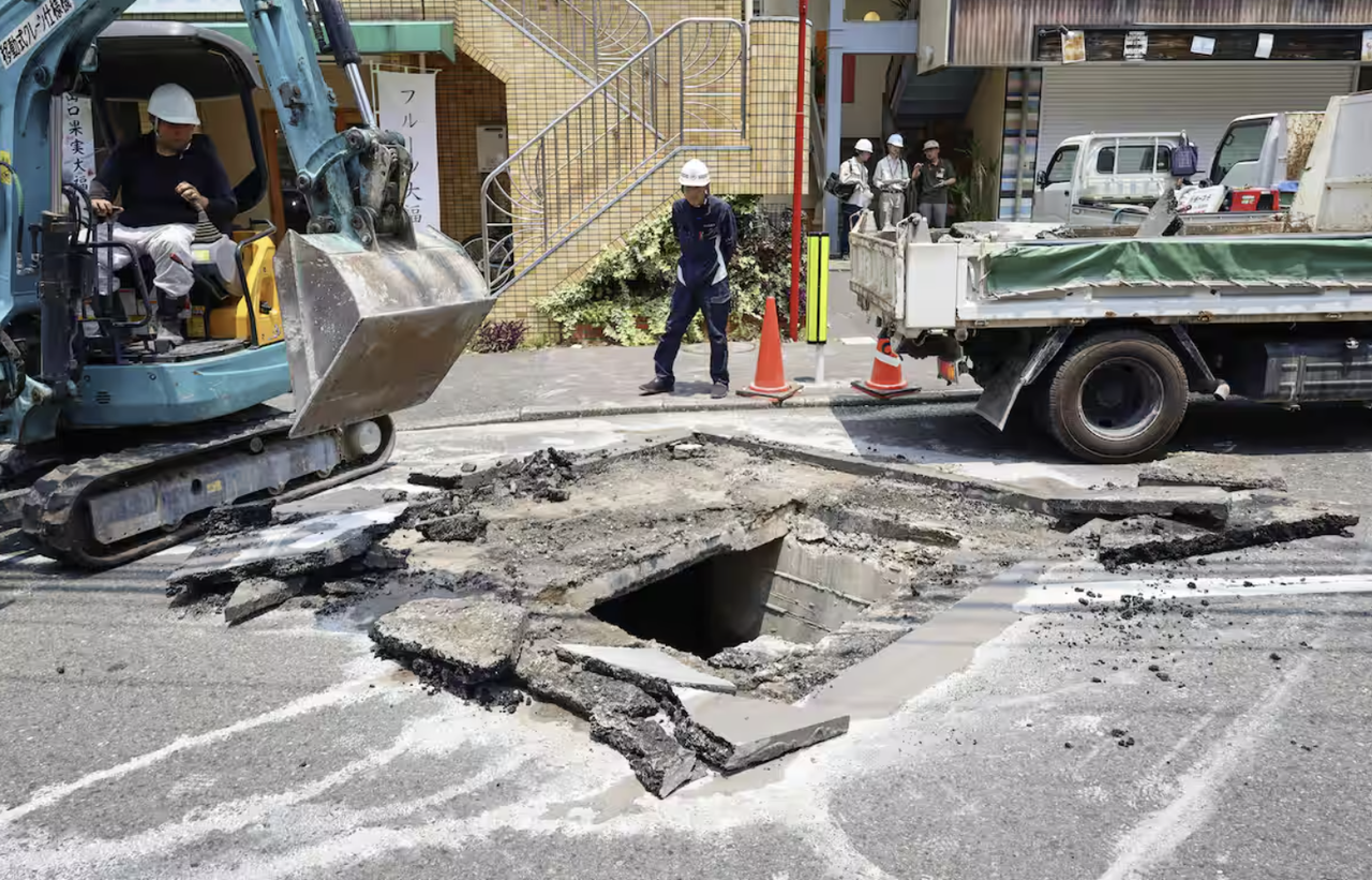 3日午前9時55分ごろ、北九州市小倉南区徳力の福岡県道で「道路が陥没した」と福岡県警に通報があった。市によると、軽乗用車の右後輪がはまったが、午前11時過ぎまでにレッカー車でつり上げられた。運転手にけがはなかった。陥没は縦約1・5メートル、横約1メートル、深さ約1メートル。市は通行止めにして原因を調べている。