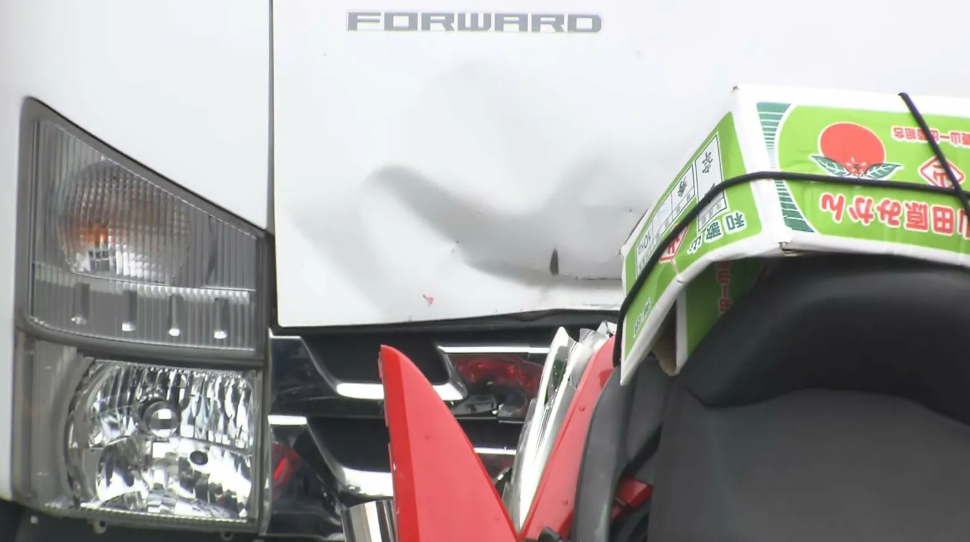 赤いバイクがトラックの前方部分にめり込み、原形がなくなっています。