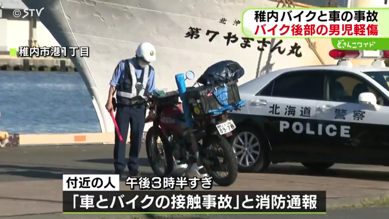 北海道稚内市の市道で、乗用車とバイクが衝突する事故がありました。