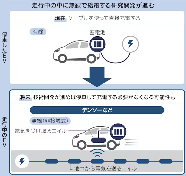 送電用のケーブルを使わずに走行中の電気自動車(EV)に電気を送る「ワイヤレス(無線)給電」の研究開発が日本でも盛んになってきた。デンソーが500キロメートルの連続運転に成功したほか、東京理科大学は給電を担う薄型のコイルを開発した。無線給電はイスラエルや欧米が先行して実証実験を進めてきた。後を追う日本は技術開発に加え、EVに送電するインフラの整備や装置の互換性を確保する取り組みなどが求められている…