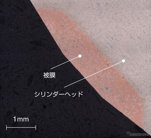 一般的なエンジンの吸気ポートは、焼結材で作られたバルブシートを圧入する構造のため形状に制約があり、タンブル流の形成に理想的な形状にすることは困難だった。今回開発したコールドスプレー工法を用いたバルブシートは、シリンダーヘッドの表面に被膜を形成するもので、別体のバルブシートが不要となり、理想の吸気ポート形状を実現している。この新しい工法は、アルミ合金製シリンダーヘッドの表面に異種の金属粉末を超音速で吹き付けることで強固な被膜を形成する。