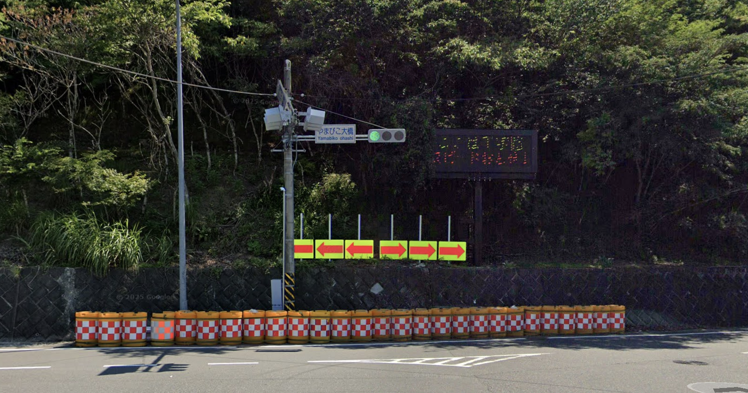 厚木署によると、現場は「宮ケ瀬やまびこ大橋」たもとの丁字路。橋から直進して正面の道路脇に並べられたクッションドラムに、乗用車がほぼ正面からぶつかったとみられる。
