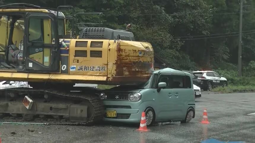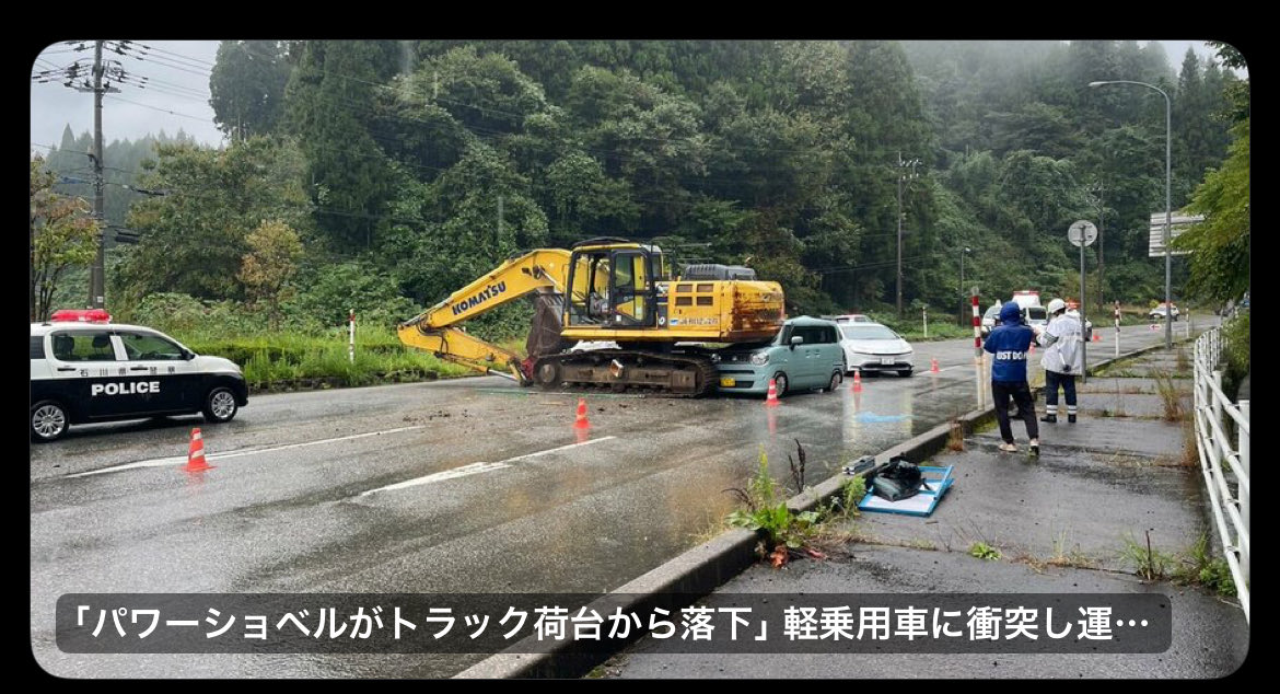 16日午前10時前、石川県穴水町小又にある県道の丁字路交差点で、左折したトラックの荷台に積まれていたショベルカーが落下し、直進してきた軽乗用車が衝突しました。