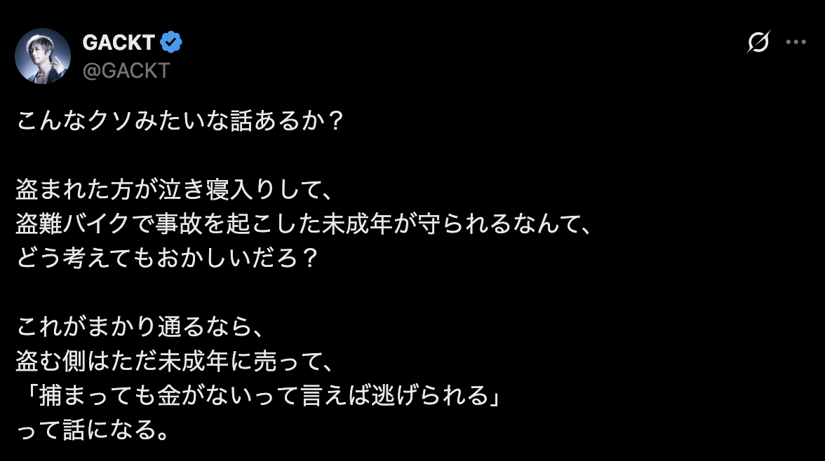 GACKTは「こんなクソみたいな話あるか?」と言い放った。「盗まれた方が泣き寝入りして、盗難バイクで事故を起こした未成年が守られるなんて、どう考えてもおかしいだろ?」