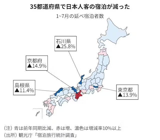 日本人観光客離れが京都以外でも、東京など35都道府県で宿泊者減少