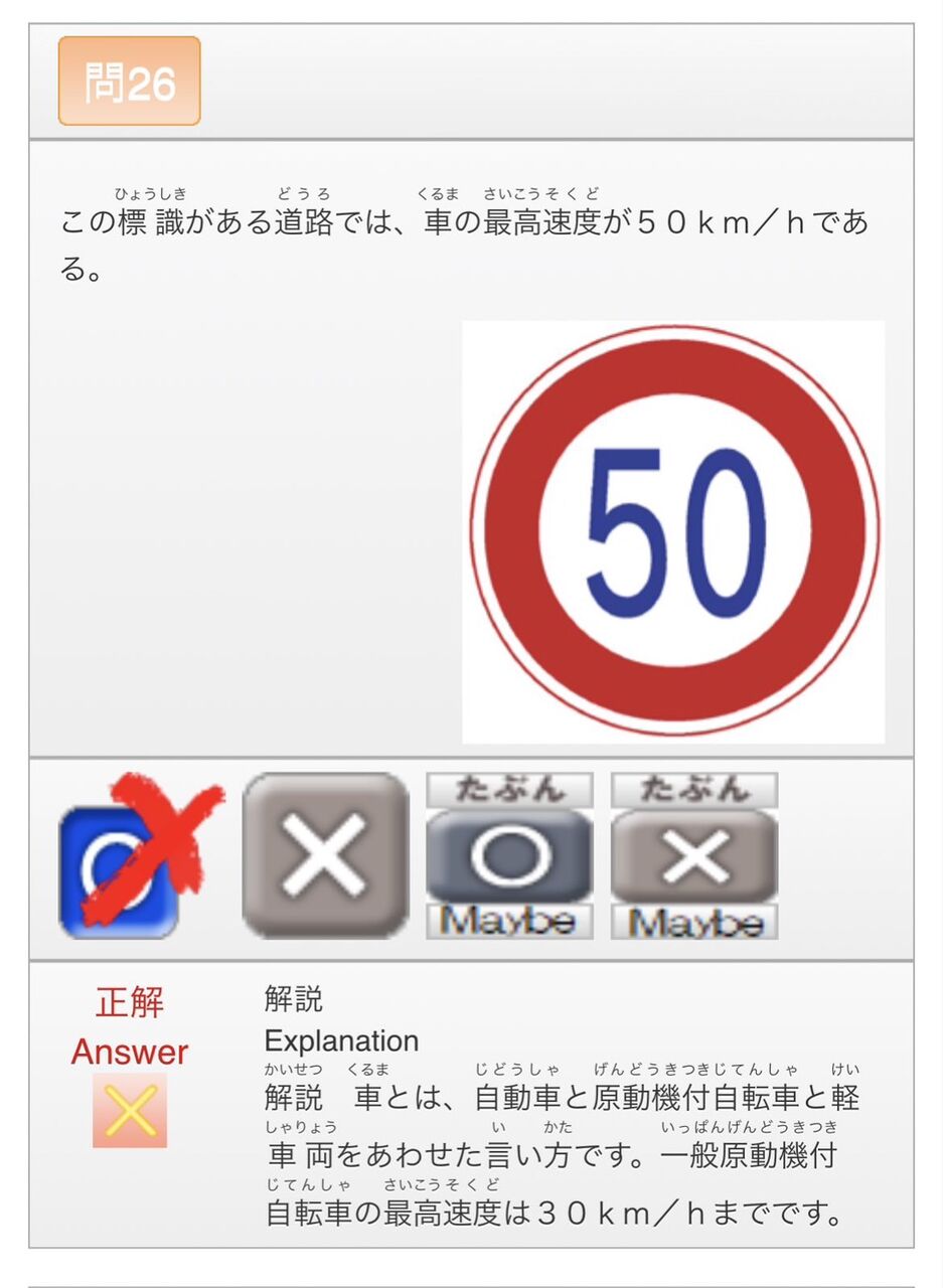 これは⚪︎が正解でしょ。「車の『最高』速度」を聞いているので、「車の種別の中で最も速度を出せるものが出して良い速度」が答えであって、それは50km/hになる。