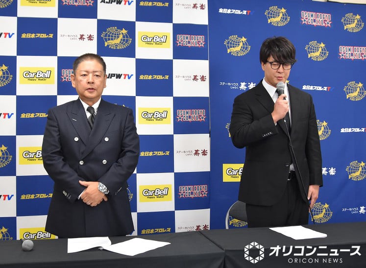 事故ついて謝罪した(左から)オールジャパン・プロレスリング取締役・十枝利樹氏、青柳優馬選手 (C)ORICON NewS inc