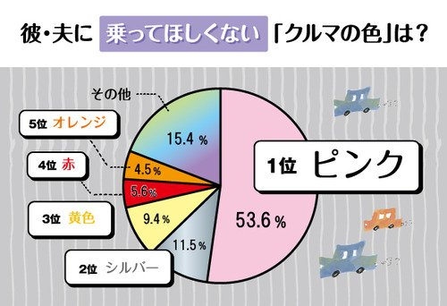 6位 その他 15.4%乗ってほしくない色の1位はピンク!なんと全体の5割を占めました。