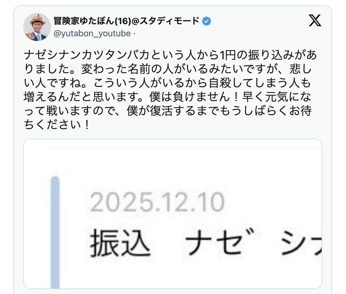 ゆたぼんは11日、「ナゼシナンカツタンバカという人から1円の振り込みがありました」と打ち明け、振り込んだ人物の名前を公開。「変わった名前の人がいるみたいですが、悲しい人ですね。こういう人がいるから自殺してしまう人も増えるんだと思います。僕は負けません!」と宣言。「早く元気になって戦いますので、僕が復活するまでもうしばらくお待ちください!」と投げかけた。