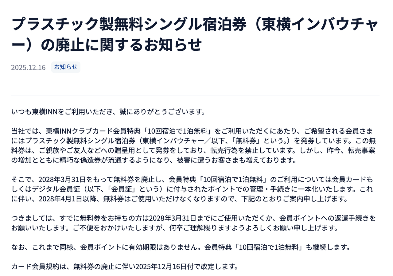 東横インは、会員特典として発行していたプラスチック製の「無料シングル宿泊券(東横インバウチャー)」を2028年3月31日をもって廃止する。