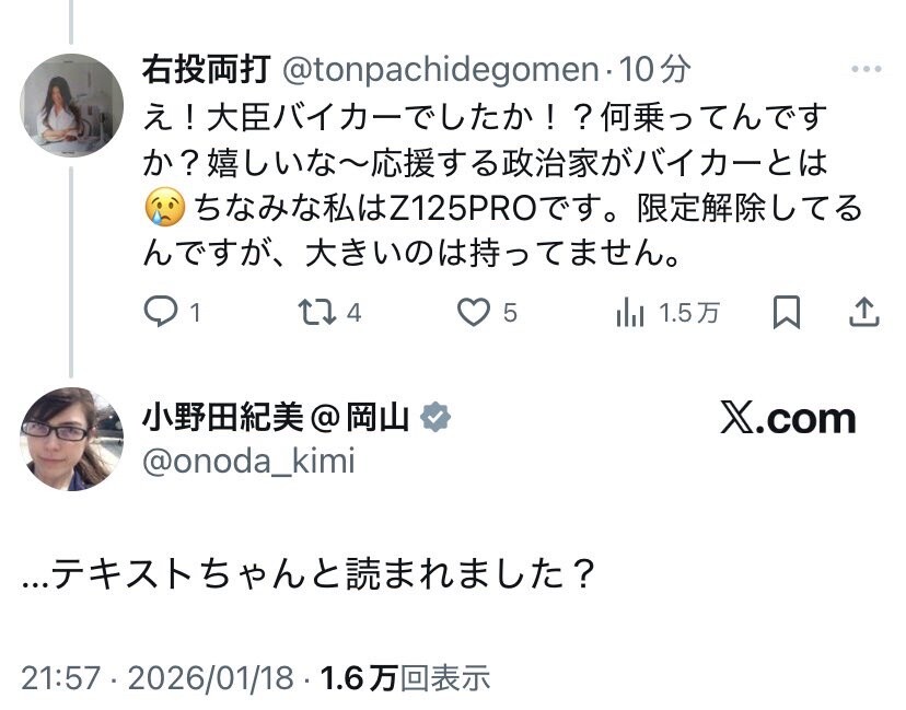 小野田紀美・経済安全保障担当相「動画に騙されないで!私バイク乗れません!」愛国者「えっ?バイク乗るんだ!」