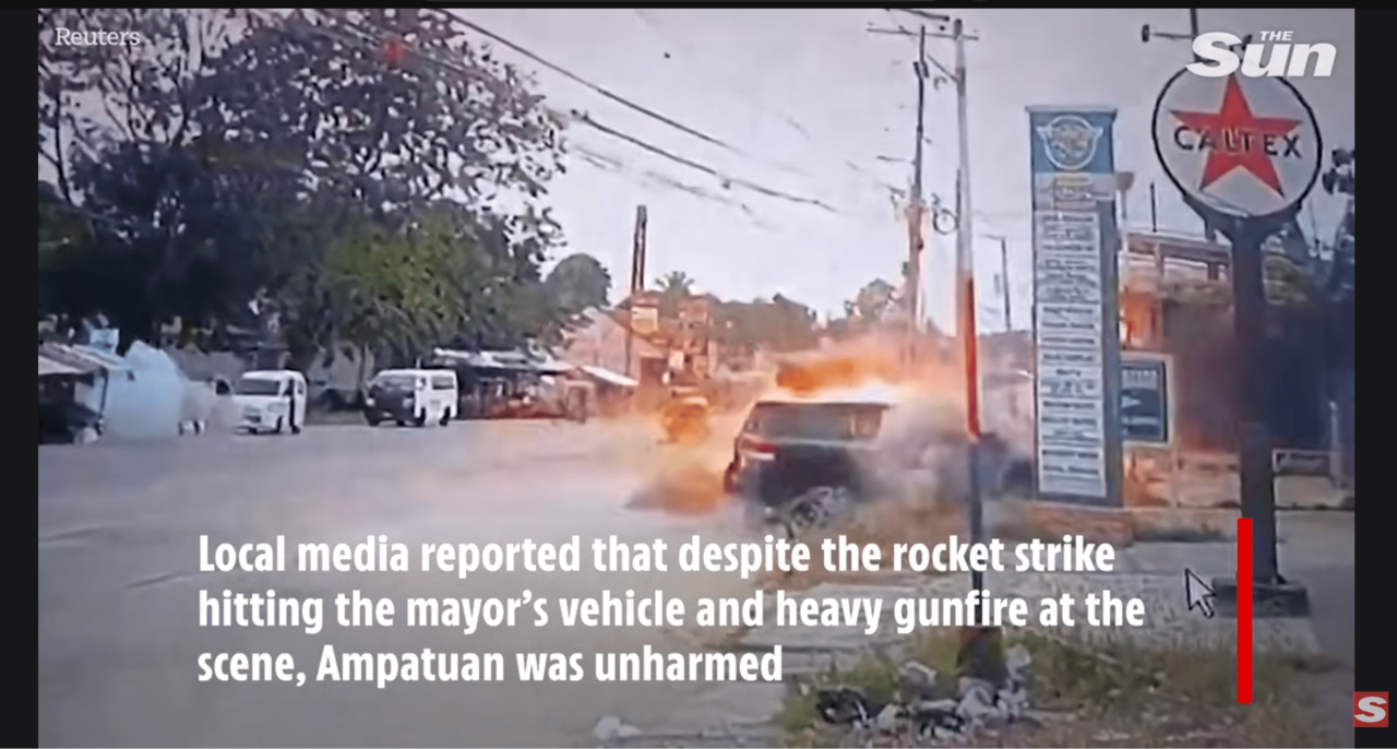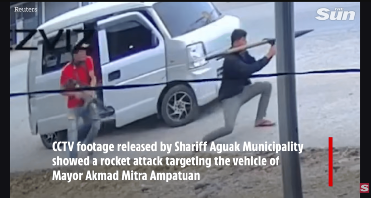 映像には、白い小型のバンから降りた2人の男性のうちの1人が、道路の反対側を走行するアクマド・ミトラ・アンパトゥアン町長が乗ったランクルに向かってRPG(ロケットランチャー)を発射する様子が映り込むほか、もう1人の男性が小型ライフルを発射する姿も捉えられている。