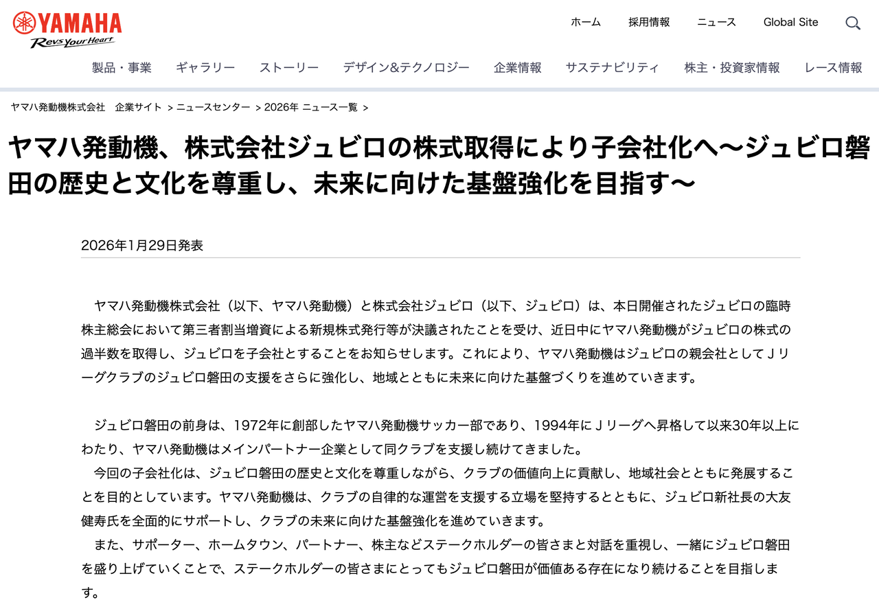 ジュビロの第三者割当増資を引き受け、30日付で株式の過半を取得する。