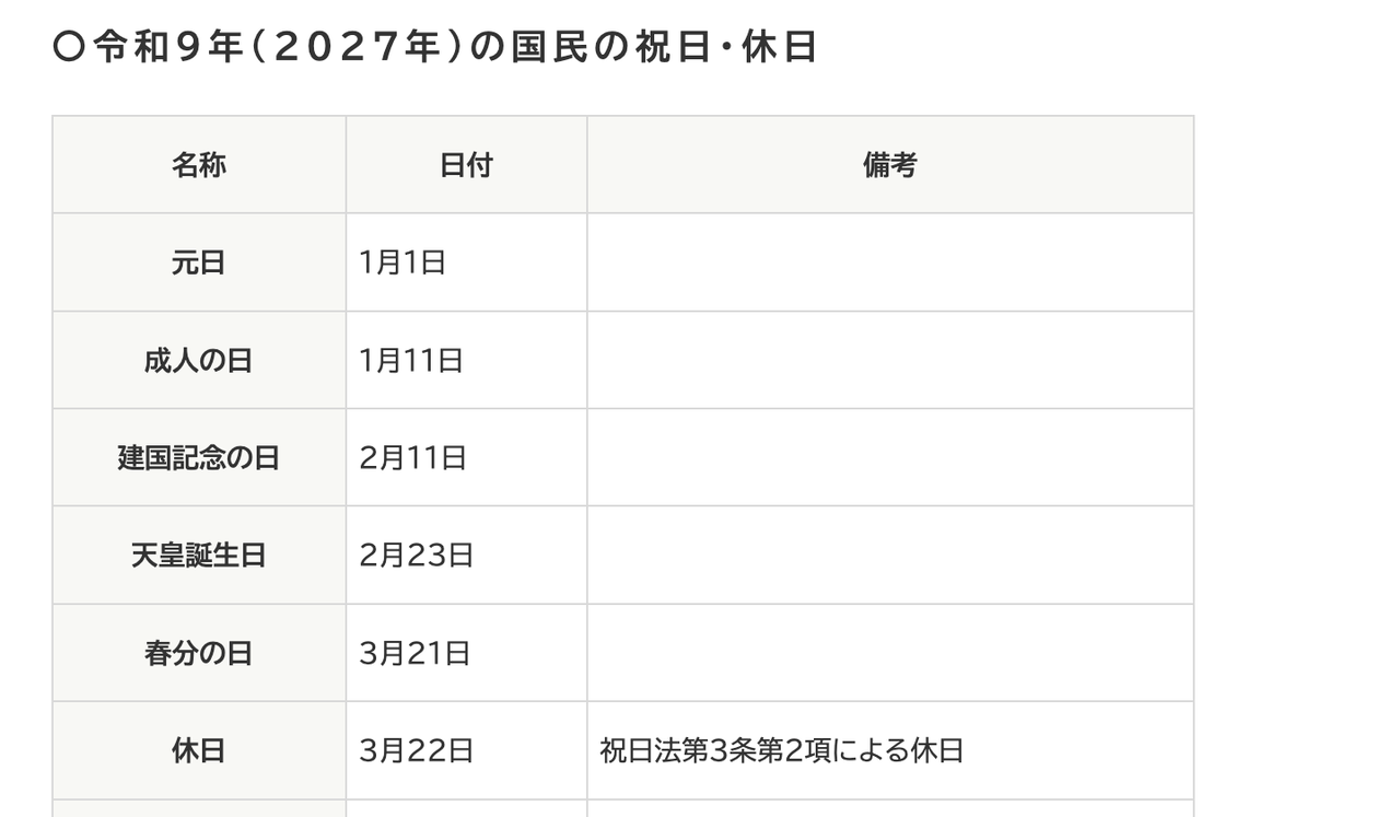 内閣府は、国立天文台が2027年の「歴要項」を発表して春分の日と秋分の日を確定させたことに伴う2027年の「国民の祝日」を次の通り発表しました。