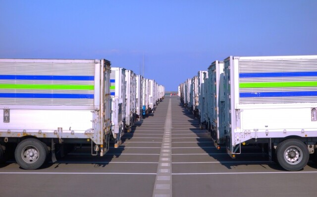 その前の道で、商用トラックが何台か路上で停車している。