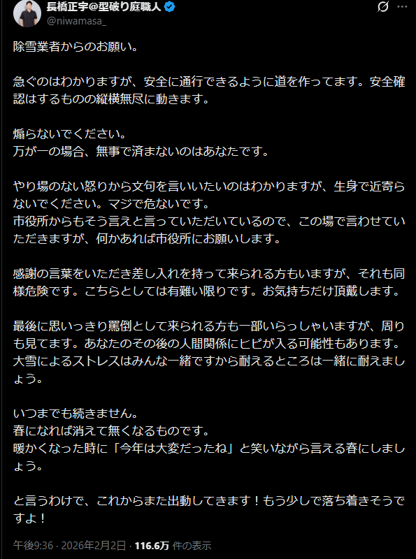 万が一の場合、無事で済まないのはあなたです。…— 長橋正宇@型破り庭職人 (@niwamasa_) February 2, 2026