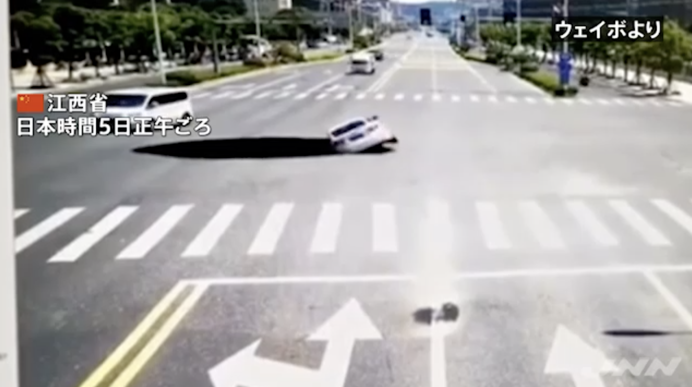 交差点の中央に突如現れた大きな穴。その後、1台の乗用車が転落してしまいました。中国・江西省で、日本時間5日正午ごろ撮影された映像です。