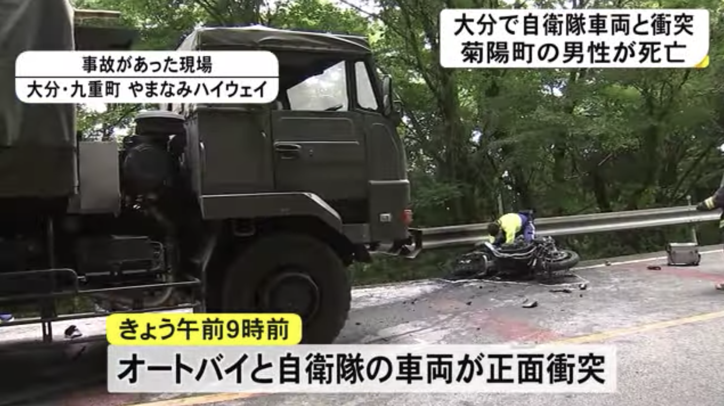 警察によると20日午前、大分県九重町の県道、通称「やまなみハイウェイ」でバイクと自衛隊車両が正面衝突する事故があった。