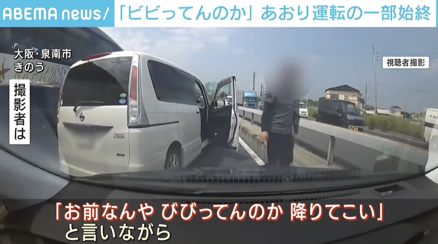 映像は大阪・泉南市の一般道できのう撮影されたもので、白いワゴン車は撮影者の男性の前に強引に割り込み、男が車から降りてくる。