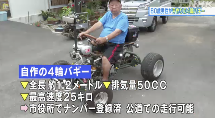 おととし、知人のバギーを見たのがきっかけで創作意欲が湧き、去年の秋から取りかかり、ことしの春に完成させました。年齢と安全を考えて自宅の敷地内や近くを走るのにとどめていますが、通りがかった人に写真を撮られることもあるということです。