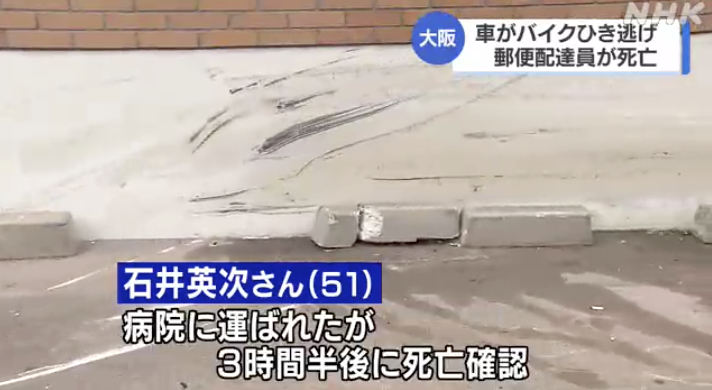南署によると、死亡したのは大阪南郵便局勤務の石井英次さん(51)=大阪府東大阪市。石井さんは業務中だった。現場は信号のある交差点で、石井さんが原付きバイクで北側から西側に右折しようとしたところ、後続の車がぶつかり、石井さんを南西角のビルの壁の間に挟んだとみられる。車はその後、ガードレールを壊して西側に逃げたという。目撃者によると、黒っぽい箱形の車だったという。