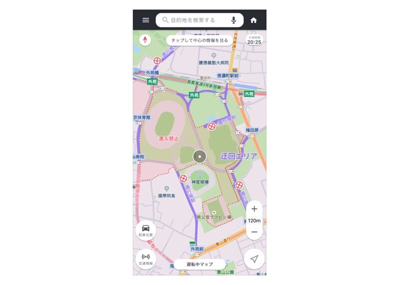 ※回避ルートを利用しているかどうかは、画面右下に表示されています。変更する場合はボタンをタップすることで選択できる。