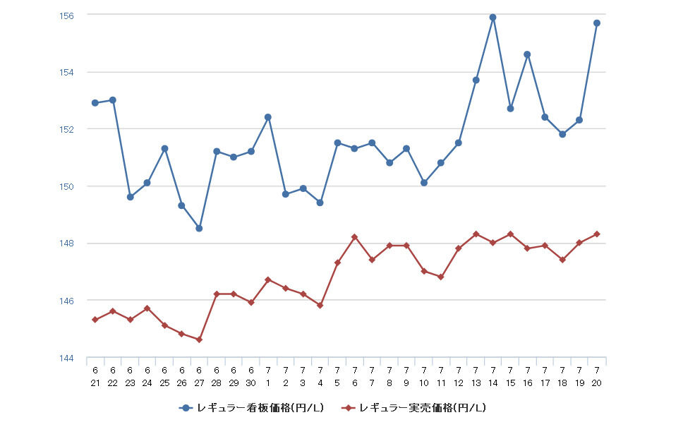 資源エネルギー庁が発表した石油製品の店頭小売価格週次調査によると、7月19日時点でのレギュラーガソリン1リットル当たりの全国平均価格は前週比0.3円高の158.3円で、7週連続の値上がりとなった。