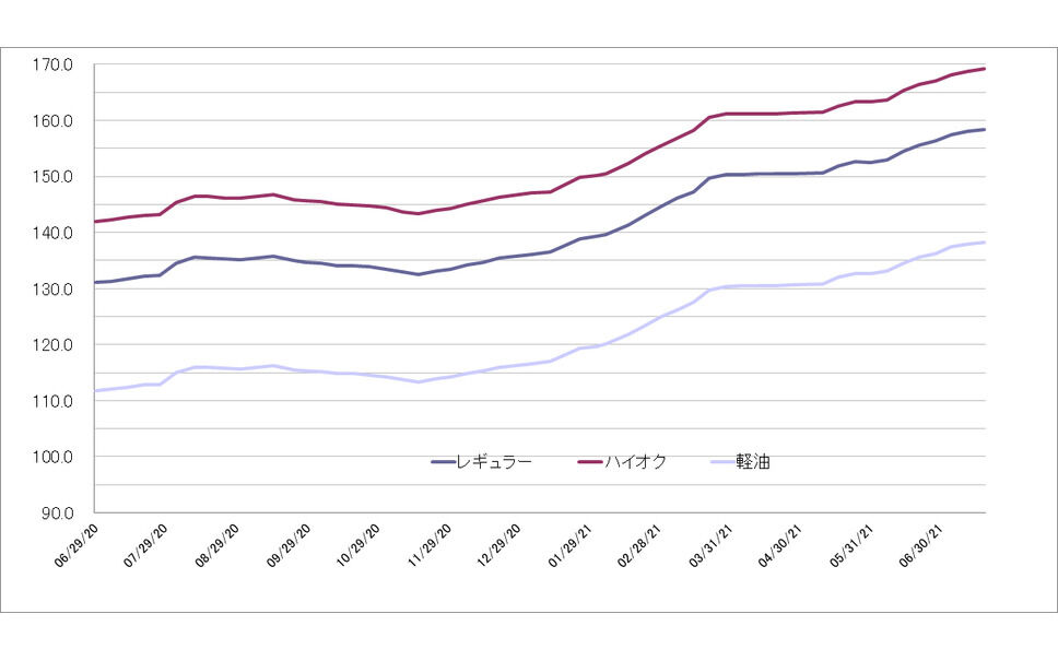 地域別では北海道は前週比0.3円高の156.6円、東北は157.0円、関東は157.6円で前週と変わらず、中部は0.1円高の158.0円、近畿は0.7円高の158.7円、中国は0.5円高の156.3円、四国は0.2円高の158.0円、九州沖縄は0.6円高の162.1円だった。