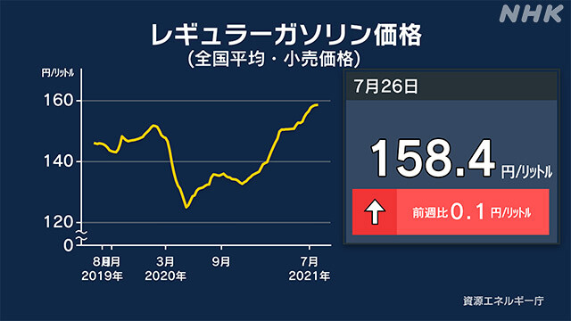 国の委託を受けてガソリン価格を調査している「石油情報センター」によりますと、26日時点のレギュラーガソリンの小売価格は全国平均で1リットル当たり158.4円と、先週より0.1円値上がりしました。