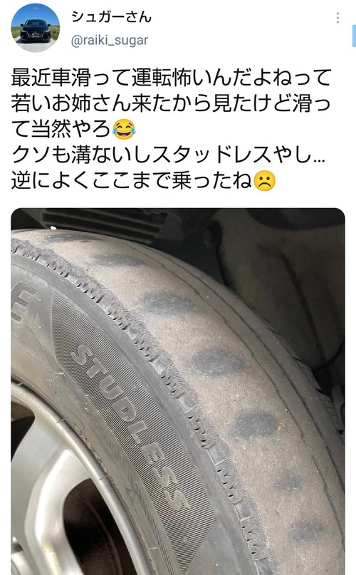 「最近タイヤが滑って危ないの!」「えぇ・・・」