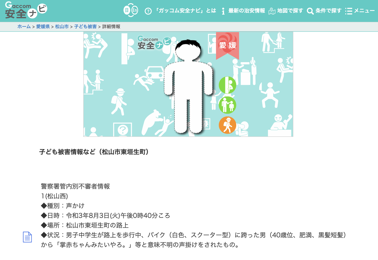 ◆状況:男子中学生が路上を歩行中、バイク(白色、スクーター型)に跨った男(40歳位、肥満、黒髪短髪)から「掌赤ちゃんみたいやろ。」等と意味不明の声掛けをされたもの。