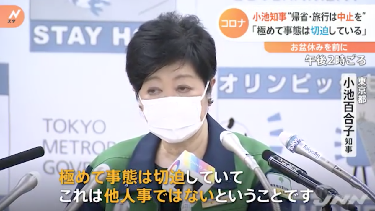 小池百合子都知事「帰省・旅行は中止を、極めて事態は切迫していて他人事ではない」