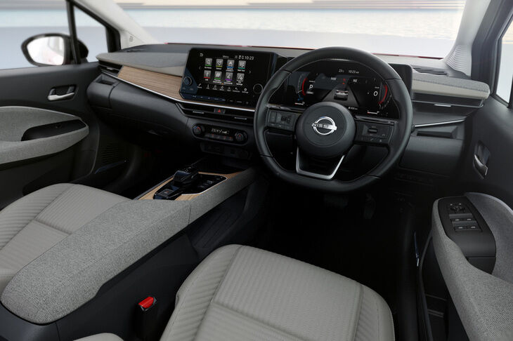 ツイード調の織物で仕立てたインテリアや、12.3インチサイズに大型化された「アドバンスドドライブアシストディスプレイ」と9インチサイズの「NissanConnect ナビゲーションシステム」(オプション)が連続するメーターパネルの採用、徹底した遮音対策なども同車の特徴となる。