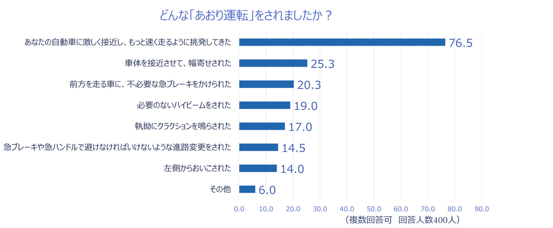 あおり運転に遭遇した時に受けた被害について聞いたところ、1位は「あなたの自動車に激しく接近し、もっと速く走るように挑発してきた」(76.5%)、2位は「車体を接近させて、幅寄せされた」(25.3%)となり、前年とほぼ同様の結果になった。