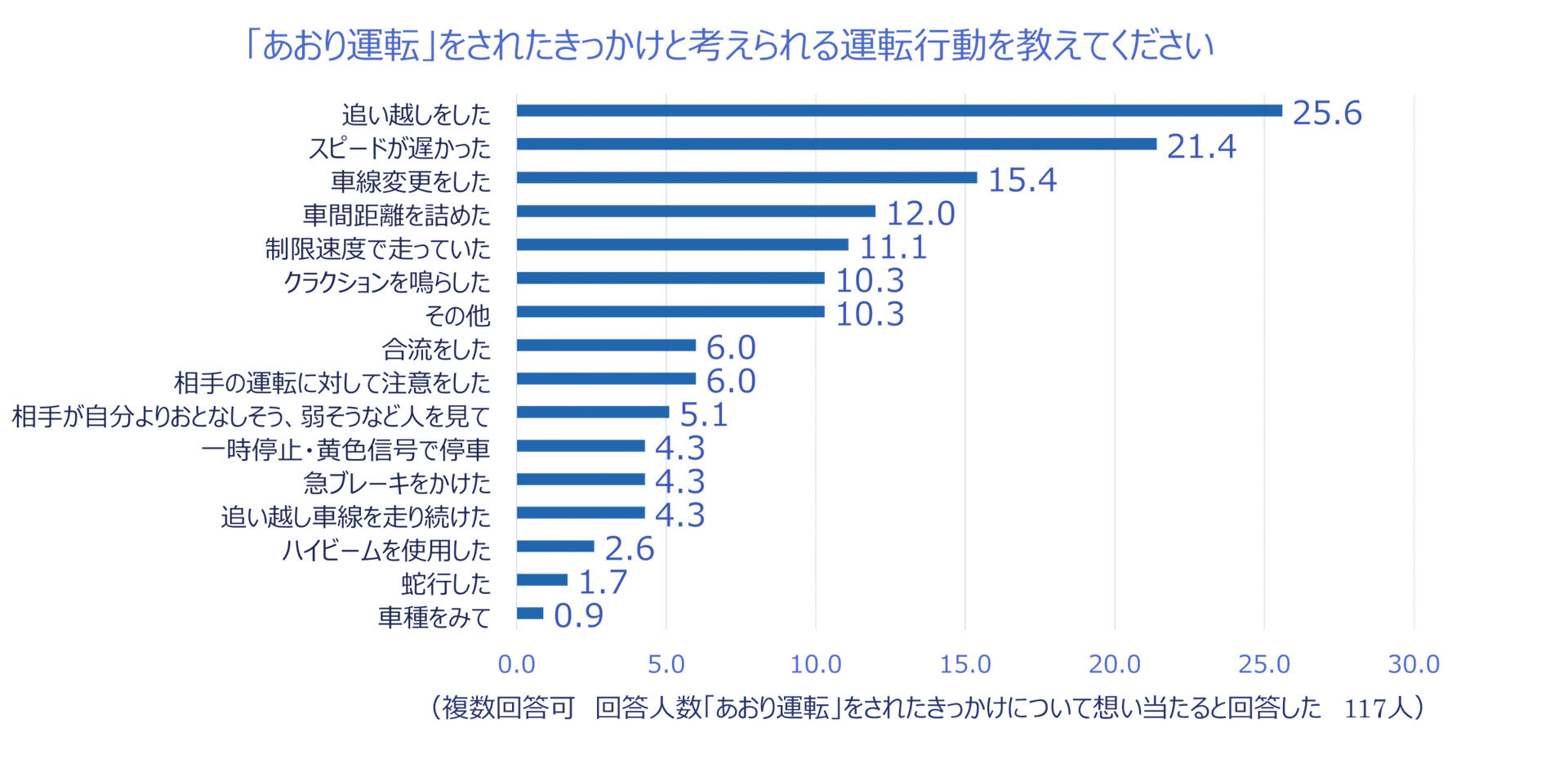 あおり運転を受けたことがあるドライバーにあおり運転をされたきっかけと考えられる運転行動を聞いたところ、1位は「追い越しをした(25.6%)」。