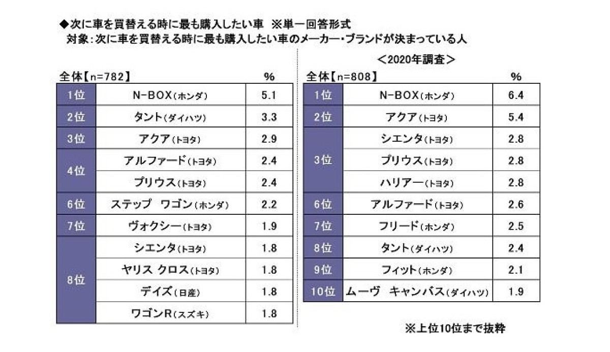 車種としては、1位「N-BOX(ホンダ)」(5.1%)、2位「タント(ダイハツ)」(3.3%)、3位「アクア(トヨタ)」(2.9%)、4位「アルファード(トヨタ)」「プリウス(トヨタ)」(いずれも2.4%)と、ホンダとダイハツの軽自動車が上位に。
