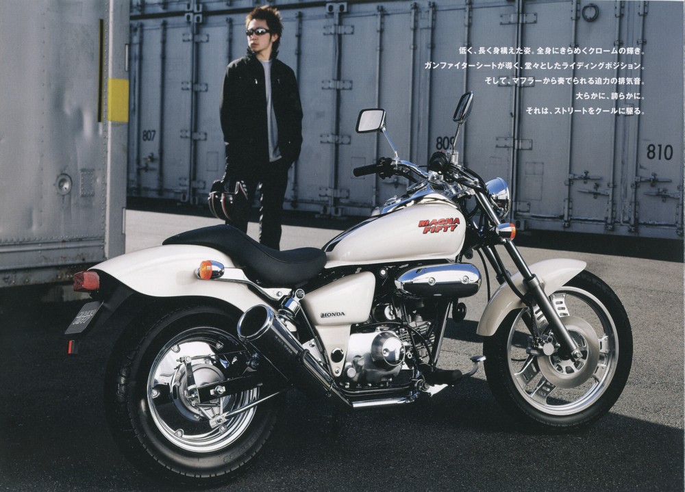 最初に紹介するホンダ「マグナ50」は、50ccでも乗れるアメリカンバイクの代名詞と言っても過言ではないでしょう。同社の「Vツインマグナ」のスタイルを継承しつつ、ロング&ローを売りにしたクルーザータイプのバイクです。一見すると50ccの原付には見えませんが、なぜ大きく見えるのでしょうか。