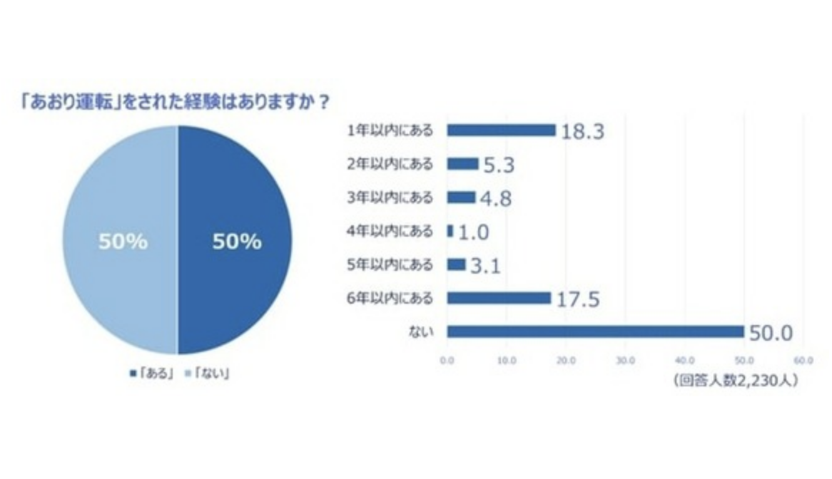 チューリッヒ保険会社が全国のドライバー2,230人を対象とした「あおり運転実態調査」によると、あおり運転をされたことが「ある」と回答した人はちょうど50%に。うち18.3%は「1年以内にある」となっています。また近年のあおり運転の報道をうけ「被害を受けないよう意識して運転している」と回答した人は76.4%。多くの人が対策をしているにもかかわらず、あおり運転は減っていないようです。