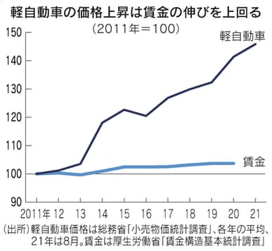 総務省の小売物価統計調査によると、11年に108万円だった軽の平均価格は21年8月には