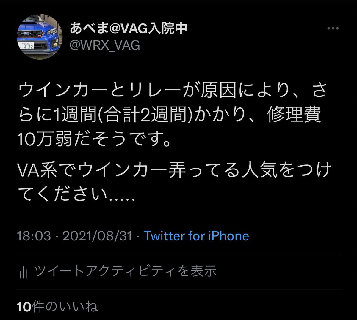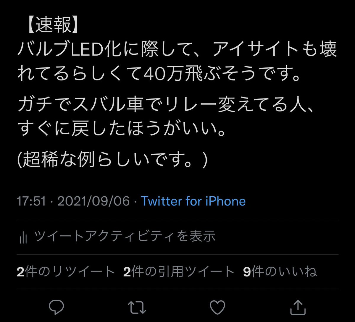 引用元: ・【当たり前の保証外】車カスのスバル車。ウインカーをLEDに交換したらアイサイト壊れ修理費40万 [866556825]