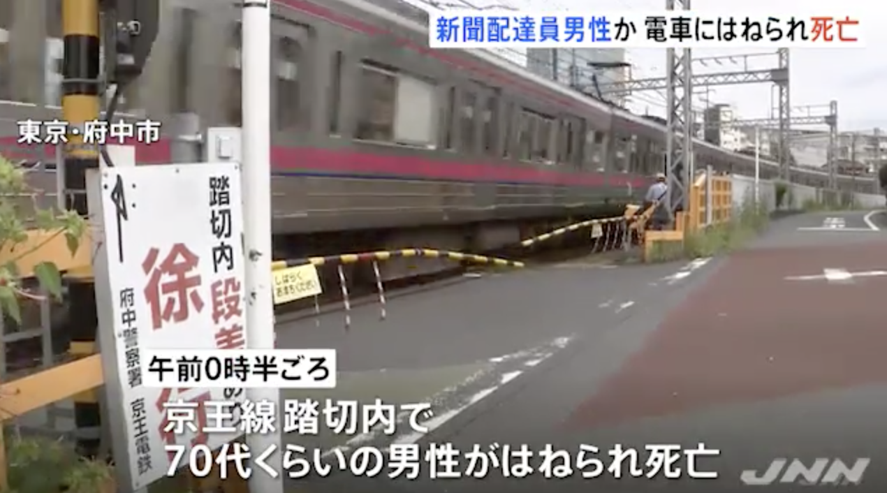 京王線の踏切で新聞配達員が電車にはねられ死亡、バイクで転倒か