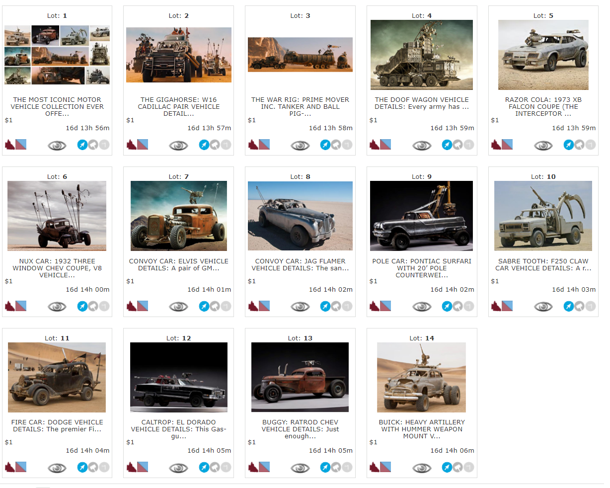 Lloydsでは、ジョージ・ミラー監督による同作から13台の車両が出品されており、ガレージにスペースがある人や、世紀末後の世界で暴君から逃げるために砂漠を爆走したいという人は入札を考えてみてはどうだろうか。