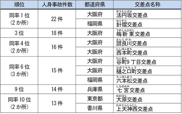【表】2020年に交通事故が多発した交差点…全国ワースト10はこちら