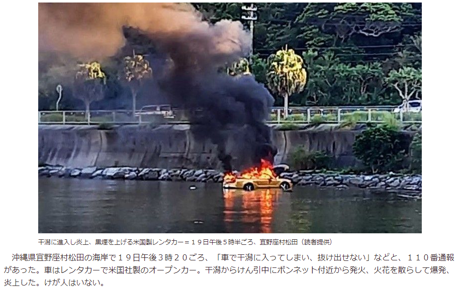 オープンカーが海で爆発・炎上…干潟に侵入し立ち往生 沖縄沖縄県宜野座村松田の海岸で19日午後3時20ごろ、「車で干潟に入ってしまい、抜け出せない」などと、110番通報があった。車はレンタカーで米国社製のオープンカー。干潟からけん引中にボンネット付近から発火、火花を散らして爆発、炎上した。けが人はいない