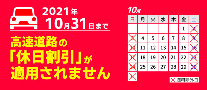 国土交通省からの依頼により、緊急事態及びまん延防止等重点措置が解除された後の対策の緩和は段階的に行うこととされているため、10月31日まで高速道路の休日割引を適用しないことといたします。ご不便とご迷惑をおかけしますが、ご理解とご協… https://t.co/hXqzRT4hG2