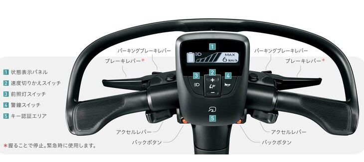 運転は本体最上部に備わるハンドルとその左右に設けられたアクセルレバーで行い、アクセル操作だけで加速・減速・停止までコントロール可能。別途、減速をサポートするブレーキレバーが備わっており、バックボタンを使って後退ができる。