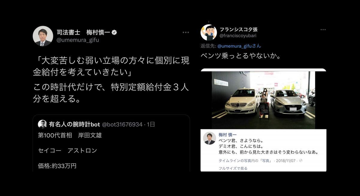 岸田総理33万円腕時計に「定額給付金3人分」梅村慎一がベンツ購入を指摘され鍵垢に